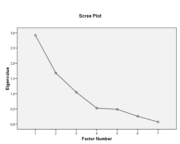 A sajátértékek táblázatából több mindent is leolvashatunk. Az egyik az utolsó oszlop legalsó száma: 70,222%-os értékével azt mondja, hogy ha a 7 változó helyett a 3 faktorváltozót használjuk (tehát a megtalálható háttérváltozókat), úgy a változókban rejlő információ 70%-át meg tudjuk őrizni. Ha figyelembe vesszük, hogy a változók számát megfelezve az információnak a 70%-a megmarad, úgy ezt egy jó modellnek tekinthetjük (általában 30%-os határt minden modellnél illik elérni, bizonyos helyzetekben akár az 50% is megkövetelhető).