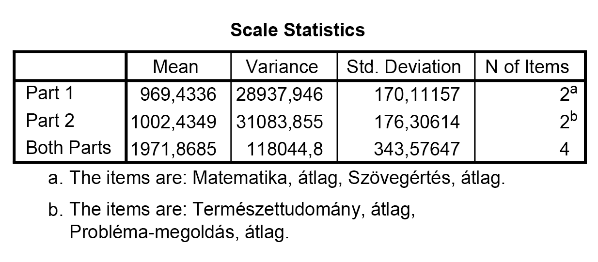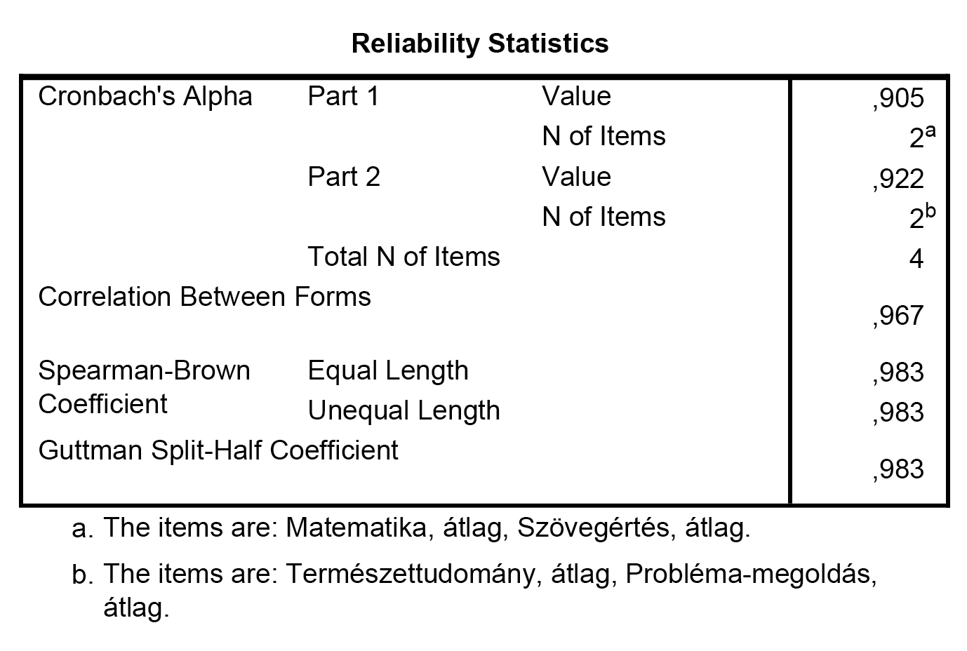 Ennek értelmében az egyesített – vagy szétbontás utáni újraegyesített – skála Cronbach-alfa értéke a Spearman–Brown-együttható, melyek közül most mindkettő 0,983-as értéket mutat. (Megjegyezzük, hogy ezek után érdemes mindig futtatni egy Alpha metódus szerinti elemzést is, mert a split-half módszerrel számított alfa-érték függ attól, hogy miként osztottuk szét az itemeket két skálára. Többek között úgy is interpretálható az alfa-érték, mint az összes lehetséges módon split-half módszerrel kiszámított alfa-értékek átlaga.)
