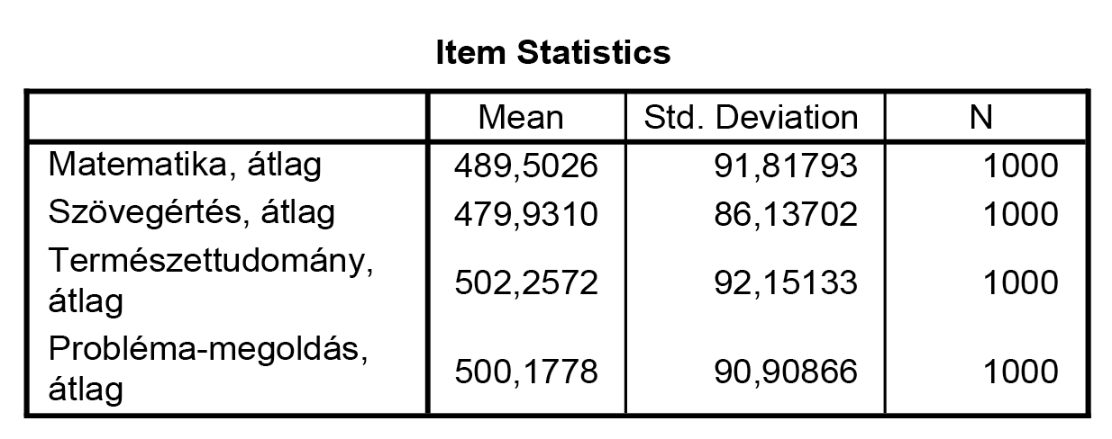 Amennyiben skálákat alkotnánk, úgy a fenti leíró statisztikai jellemzőkkel bírna a rendszer által kiválasztott két skála. Ha ehelyett a két változó/item átlagát tekintenénk, úgy ezen értékek módosulnának.