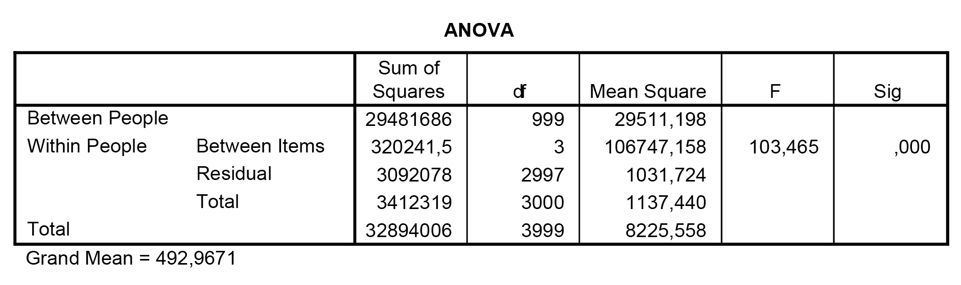 Az ANOVA táblázat adatai az mutatják meg, hogy az egyes emberek között (between) vagy egy-egy ember esetében az itemek között (within) tapasztalható-e nagyobb variabilitás. Megfigyelhető, hogy az emberek közötti különbségek lényegesen nagyobbak, mint az 1-1 itemen mért eltérés – így megállapítható, hogy egy igen erős konzisztenciával bíró átlagot tudnánk e 4 teljesítmény-változó segítségével készíteni. Ennek másfajta megfogalmazása: vélelmezhetően igen hasonló készségeket, képességeket, hátteret mérnek ezek a változók – legyenek bár igen hangzatosan, különböző nevekkel illetve.