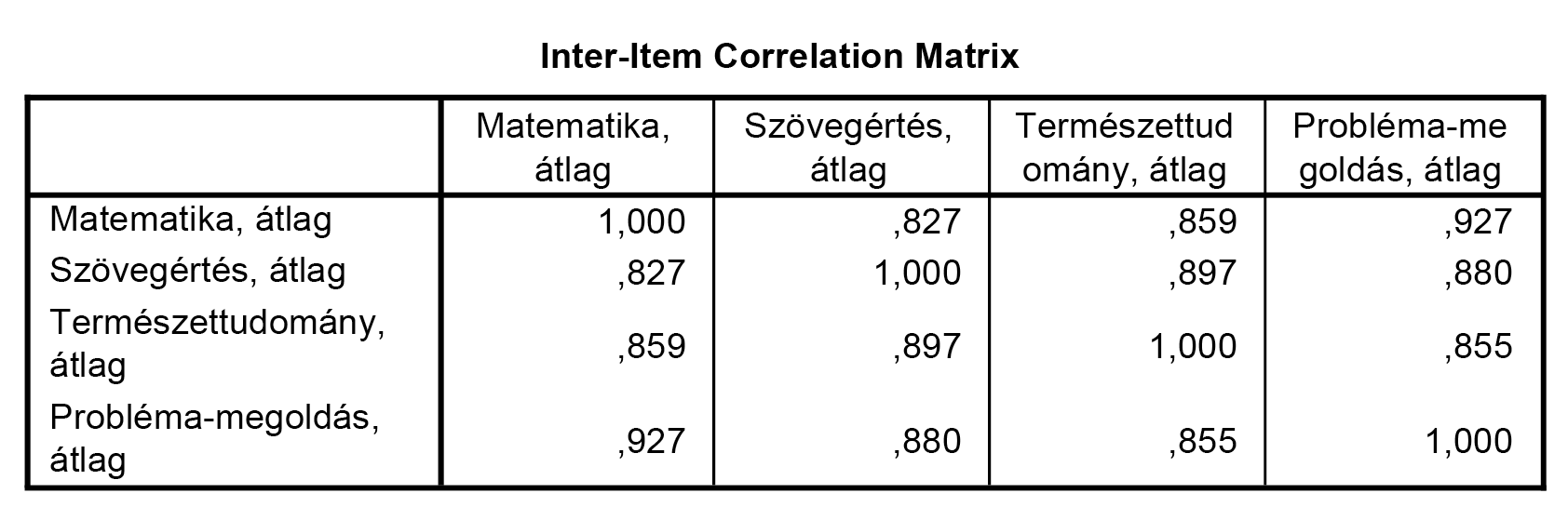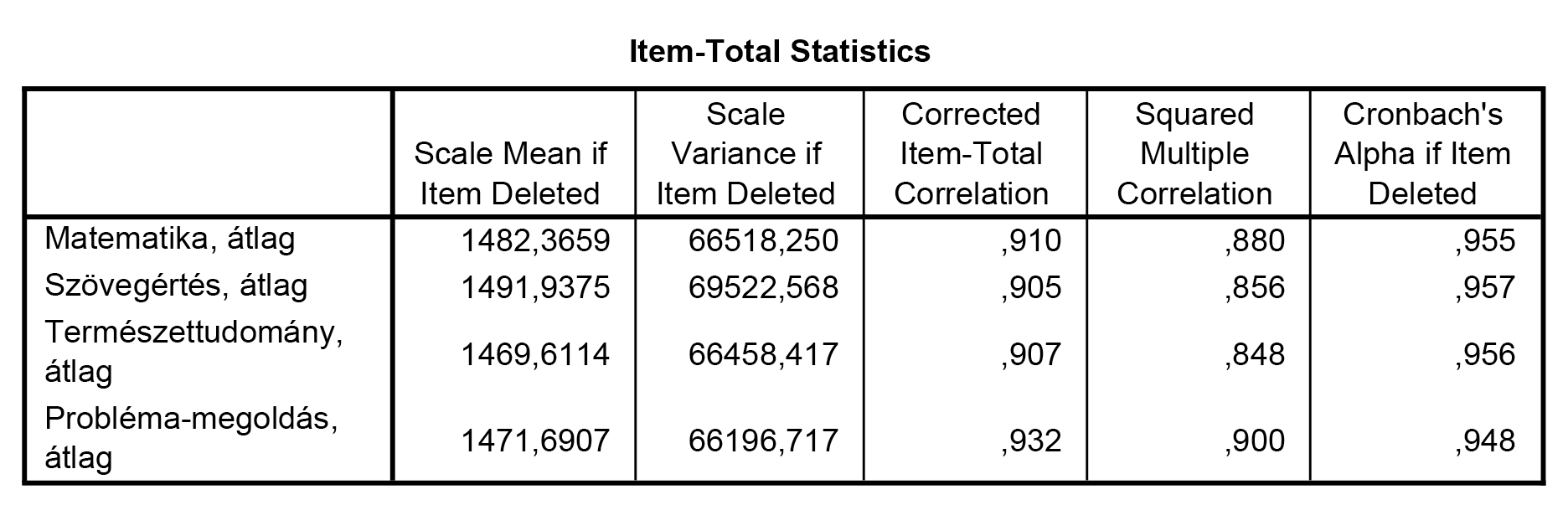 Az Item-Total Statistics táblázat utolsó oszlopában azt láthatjuk, hogy ha az adott itemet törölnénk a skálából, akkor a maradék itemeknek hogyan változna a Cronbach-alfa értéke. |