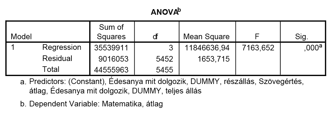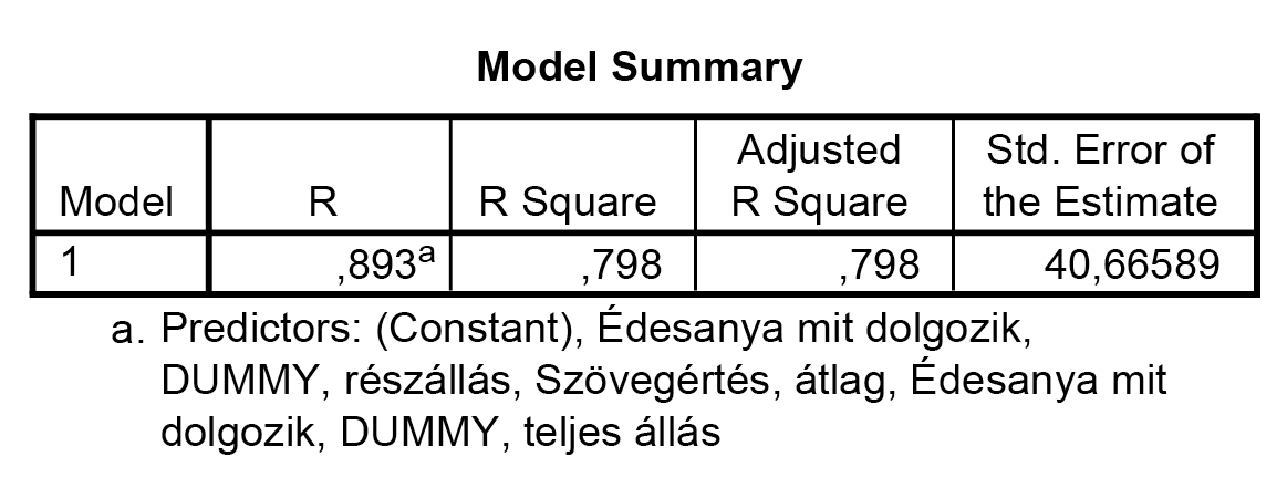 A teljes állás DUMMY változónál látható, szignifikánsan nem 0 – tehát relevánsan jelen lévő – együttható azt üzeni, hogy amennyiben az édesanya nincsen otthon, teljes állásban dolgozik, úgy a vizsgált diákoknál, azonos szövegértés-szinten –4,4 pontos differenciát látunk (azaz akinél az édesanya teljes állásban dolgozik, annak valamivel több, mint 4 ponttal gyengébb a várható teljesítménye).