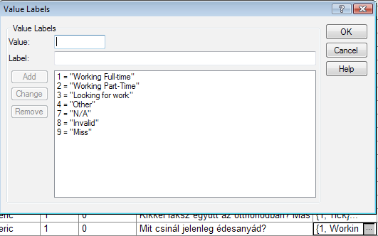 E fenti változó tehát az összes kódból az első kettőt használja, minden mást a 3-as új kódban jelöl, hiányzó értékeket és nem normál munkaviszonyt egyaránt. E kódolás olyan szempontból mindenképpen jogosnak vehető, hogy ha minket a két hagyományos (teljes munkaidős vagy részmunkaidős) munkaviszony hatása érdekel, úgy a többi esetet nyugodtan kezelhetjük egy kalap alatt.