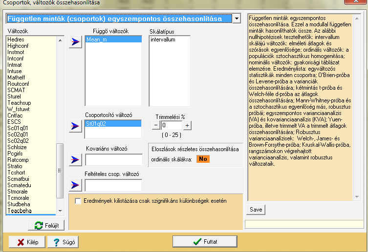 Azért használjuk ezen elemzésre a ROPstatot, mert egyrészt egyszerűbb az output felépítése, másrészt pedig a ROPstat rendelkezik azzal a jó tulajdonsággal, hogy a skálatípus-átállítás segítségével azonnal át tudunk lépni rangstatisztikai eljárásokra. Miután a pszichológiai változók jelentős része ordinális változó (nem normális eloszlású), így ezt az opciót mindenképpen érdemes kiaknáznunk.
