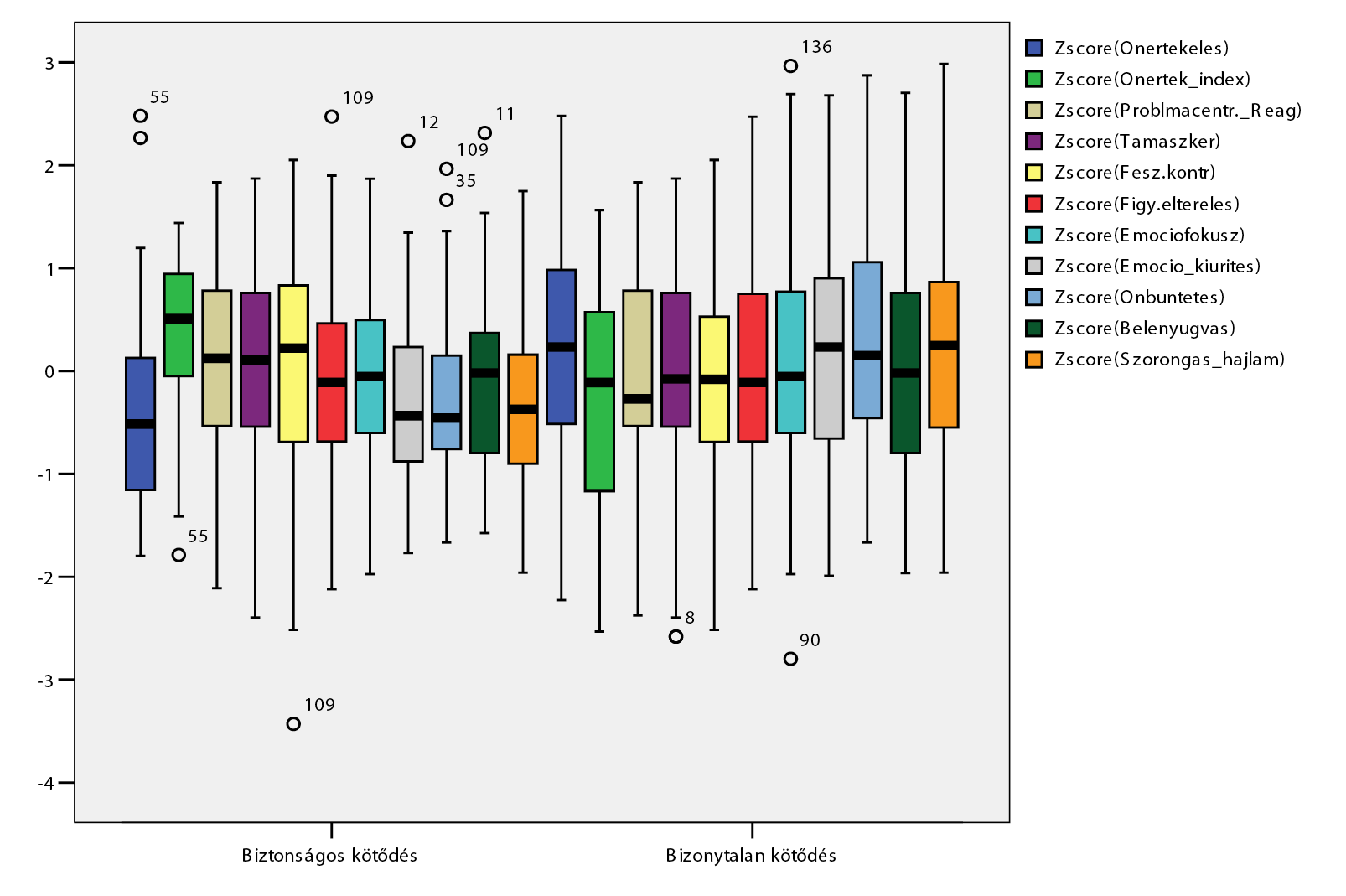 A különböző megküzdési módok átlagértékei jelezték a kötődéssel való feltételezett együtt járást, hisz a biztonságosan kötődők nagyobb mértékben választották a problémacentrikus reagálást és támaszkeresést, magasabb volt a feszültség kontroll értéke és kevésbé preferálták a többi kategóriát (emóció-fókuszú megküzdés), s a bizonytalan kötődést mutatók éppen fordítva.