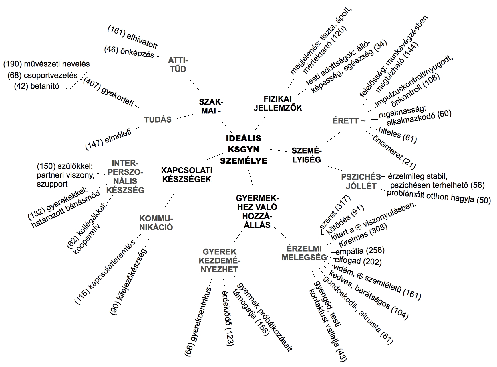 Az ideális kisgyermeknevelő személyi kívánalmainak összetett voltát az 1. ábra szemlélteti. Az ábra egy-egy pontját bővebben is kifejtjük, melyek a tartalomelemzés révén többletinformációhoz juttattak az ismert irodalmakhoz (pl. Falk, 1981; Korintus Mné és mtsai, 1997; Tardos, 1980) képest.