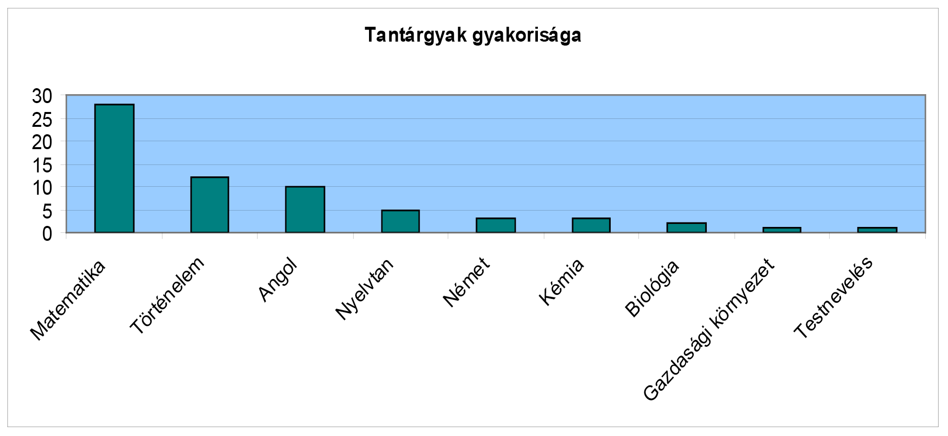 Vizsgálatunkban kilenc különböző tantárgyat jelöltek meg a tanulók olyan tárgyként, amely szorongáskeltő számukra az iskolában (1. ábra). A mintában szereplő tanulók (N=64) közül a legtöbben a matematikát (28 fő), a történelmet (12 fő), és az angol nyelvet (10 fő) nevezték meg. Vagyis ezek a tantárgyak okoznak a tanulók számára leginkább kellemetlen érzéseket és gondolatokat. További néhány esetben a nyelvtant (5 fő), német nyelvet (3 fő), a kémiát (3 fő), a biológiát (2 fő), a gazdasági környezetet (1 fő), illetve a testnevelést (1 fő) írták be szorongáskeltő tárgyként.