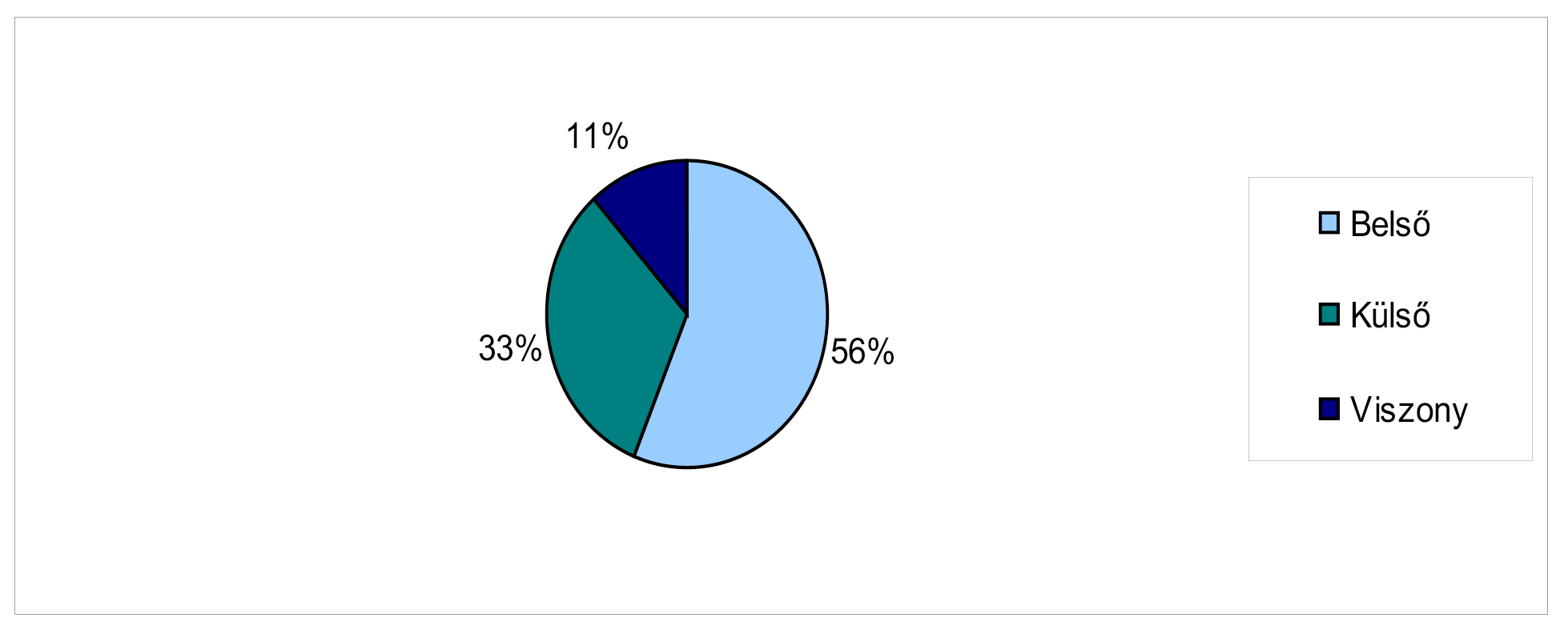 A tanulók minden esetben legalább egy, legfeljebb három különböző alkategóriába sorolható okot említettek meg a tantárgyi szorongás magyarázataként (átlag: 1,9). Ahogyan az ábrán látható, az okok említésének nagy hányada (56%) leginkább Belső okokból áll. Vagyis a szorongás okát a tanulók leginkább abban látják, hogy kellemetlen érzések (például izgalom, félelem), és önértékelési problémák (például kisebbrendűségi érzés, magabiztosság hiánya) jelentkeznek a tantárggyal való találkozáskor. Továbbá a képességeik, a tudásszintjük, illetve a teljesítményük sem felel meg a saját, illetve a környezet elvárásainak. Emellett negatív attitűdöket is mutatnak a tanulók a tantárgy, olykor a tantárgyat tanító tanár iránt, amely hatást gyakorol a későbbi tanuláshoz való viszonyulásra, és a teljesítményre egyaránt (Csapó, 2000). A jelölések további egyharmada Külső okokat (33%), azaz kontextuális tényezőket foglal magában, melyben szorongást kiváltó okként részben a társas környezetet, különösen a tanári hozzáállást és tanítási módszereket, illetve a magas szülői elvárásokat gondolják a tanulók. Ezeken túl magát a tantárgyat, a tanulási folyamatot, és a tanulási- és teljesítményhelyzetet (például felelés, dolgozatírás) feltételezik háttérben álló tényezőnek, amelyek erősen hatnak a szorongás fennmaradására (Cassady, 2010). Az elemzés azt mutatja, hogy további kis részben Viszony okokkal (11%) magyarázzák a szorongásukat a tanulók, ezen belül a tantárggyal, vagy a tanárral való össze- nem- illést említik meg (például érdeklődés hiánya a tantárgy iránt, rossz kapcsolat a tanárral). A másik illeszkedési problémát jelző tényező pedig a társas összehasonlítás során tapasztalt másoktól való lemaradás (például gyengébb képességek, lassabb előrehaladás). Tehát a minta tanulói leginkább arra hajlanak, hogy a szorongás okát önmagukban keressék, és kevésbé vetítik a környezetre a problémájukat a tantárgyi szorongás terén.