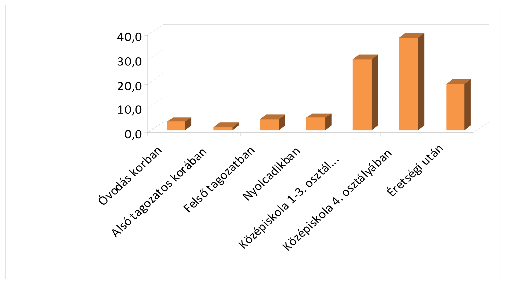 Az első ábrán láthatjuk, hogy a Debreceni Egyetem Egészségügyi Kar Ápolás és Betegellátás és Egészségügyi ügyvitelszervező alapszakos hallgatói zömében az érettségi körül döntöttek úgy, hogy ezt a szakmát választják. A társadalmi gazdasági bizonytalanságok közepette ez nem meglepő, valamint az életkorból adódó bizonytalanságokat figyelembe véve sem várhatunk más eredményt. Kevés azon hallgatók száma, akik igazán elkötelezettek, korán szakmát választottak.