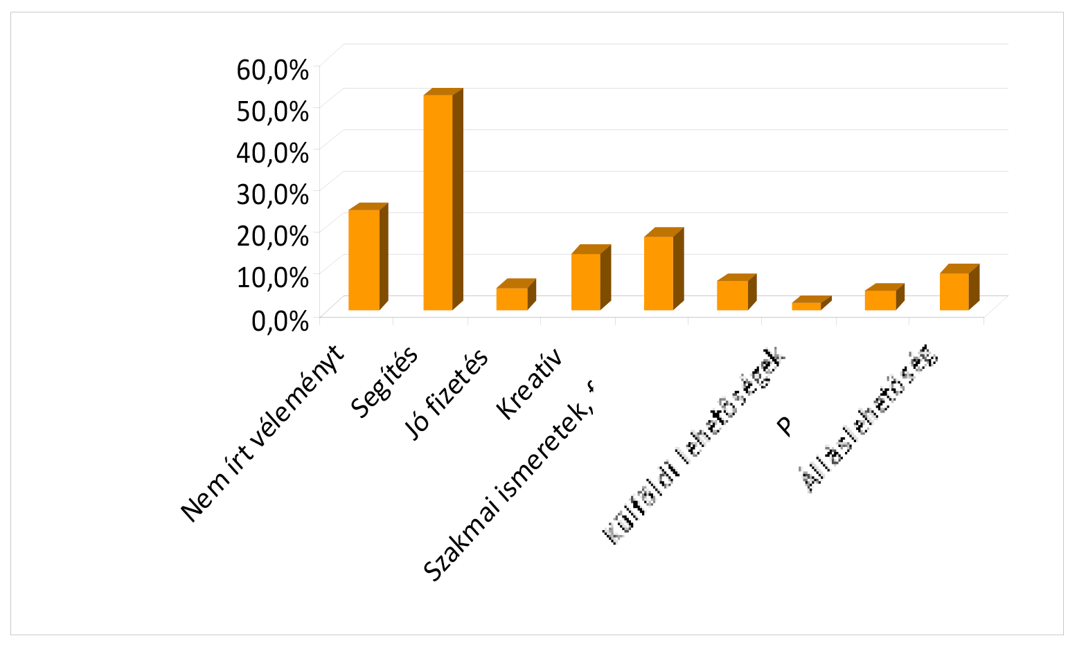 Itt is megfigyelhetjük a válaszok egyszerűségét, kevés kreatív ötletet tartalmaznak. A hallgatók 20%-a nem is gondolkodott e kérdésről. A válaszadók felénél a segítői attitűd, mint vonzó tényező a legfontosabb. A mindennapi munkában való helytállás során fontos tényező annak ismerete, hogy milyen pozitív, előnyös jellemzői vannak a tevékenységnek. A képzés során ennek tudatosítása alapvető feladat.