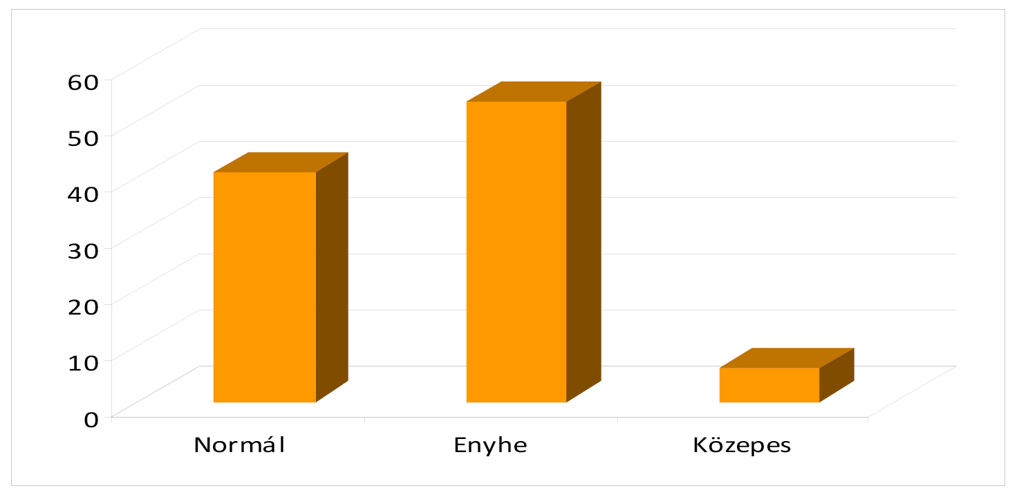 A 10. ábra a Beck depresszió skála rövidített változata alapján kapott hallgatói eredményeket mutatja be. Súlyos depresszióval nem találkozunk, ám figyelemreméltó, hogy a megkérdezettek közel fele, (53,3%) enyhe depressziós jellegzetességekkel bír.