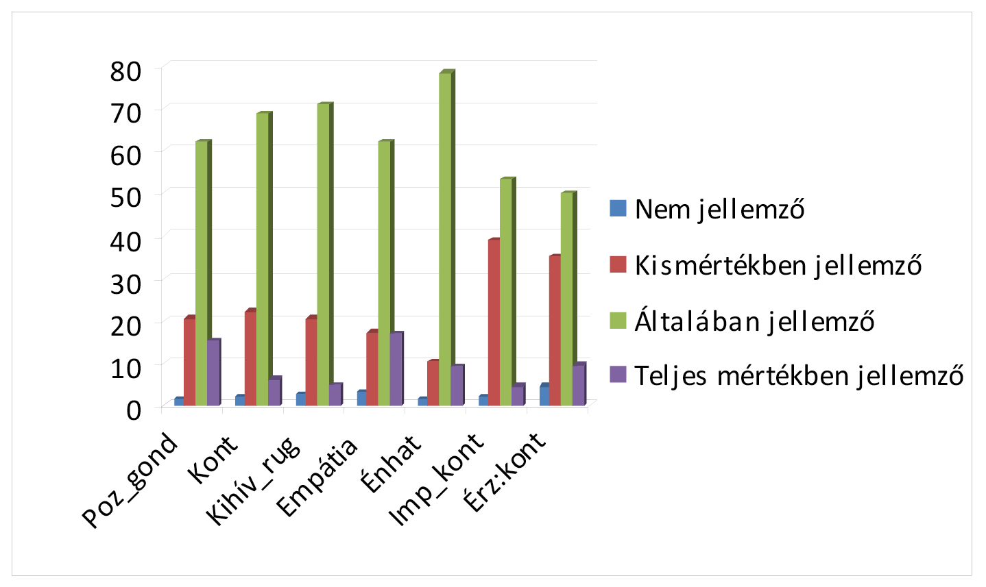 Az ábrából láthatjuk, hogy hallgatóink mind a pozitív gondolkodás, mind a kontrollfunkciók, mind a rugalmasság, mind az empátia, valamint az én-hatékonyság dimenziókban is jó színvonalú önjellemzést adnak. Az indulati és érzelmi kontroll tekintetében azonban vannak hiányosságok. Ezeket figyelembe véve a stresszel való megküzdés, a mentális státusz erősítése az alapvető feladat.