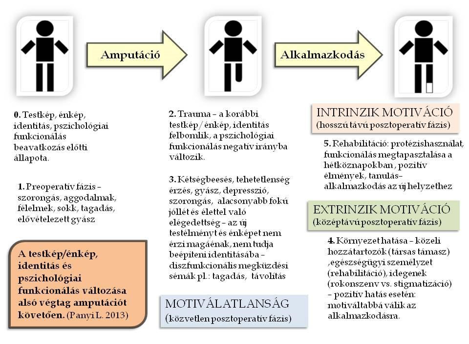 Az amputációhoz való alkalmazkodás folyamata erősen függ attól, hogy az egyén hogyan éli meg a beavatkozást, hogyan képes azonosulni az „amputált-léttel”. A megküzdési folyamat során be kell építeni az ’én’-be a megváltozott testképet, mind protézissel, mind pedig anélkül. Számos olyan változás is történik, melyek a testképen túl a személy egész énképét érintik, s az identitás újrakonstruálását teszik szükségessé (Senra és mtsai, 2011)