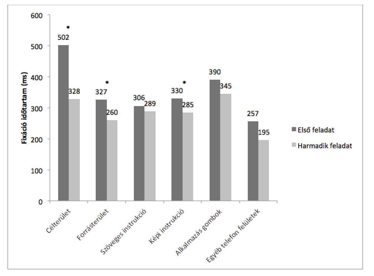 A fixációs időtartam lerövidülését a felület elemeire lebontva is szemügyre vettük. A rövidülés arra enged következtetni, hogy az adott elemet a harmadik feladatra hatékonyabban dolgozták föl a felhasználók. Az összetartozó mintás t-próbák szerint a célterület, a forrásterület és a képi instrukció esetében volt szignifikáns a fixációk rövidülése.