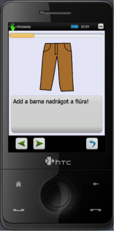 Ábra 1: a tekintetkövető gép képernyőjén baloldalt a mobiltelefon és a rajta futó HANDS alkalmazás volt látható, aminek gombjait a résztvevők az egér segítségével vezérelhették. A képernyő job oldalán az “öltöztetős” feladat volt látható: a HANDS alkalmazás instrukciói alapján kellett felöltöztetni a pálcikafigurát.