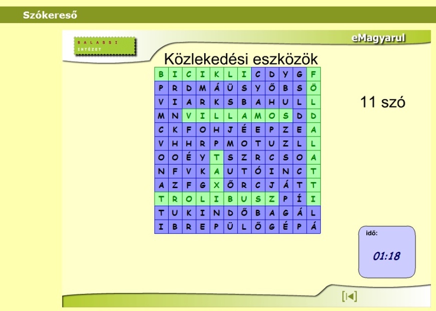 Szókereső (7. ábra): a megadott idő alatt, adott témakörben a megadott számú szót kell megtalálni a négyzetekre felosztott mezőben, vízszintes és függőleges irányban. A betűkre rákattintva azok színe megváltozik, ha helyes a szó. Ha a felhasználó nem talál meg néhány szót az idő lejártáig, akkor azokat a program automatikusan (piros színnel kiemelve, mint a javításokat) megjeleníti.