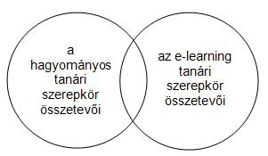 E tevékenységi körök együttesen vagy külön-külön is megjelenhetnek a tanár munkájában. Összességében elmondható, hogy a hagyományos tanári szerepkörhöz több olyan feladat, szerep is járul az e-learning alkalmazásának folyamatában, mely korábban nem jelent meg az oktatás során. Logikusan következik mindebből, hogy a megváltozott, kibővült oktatói szerep alapos, átgondolt felkészülést igényel a tanártól. A megváltozott szerepeket jól szemlélteti az alábbi ábra: