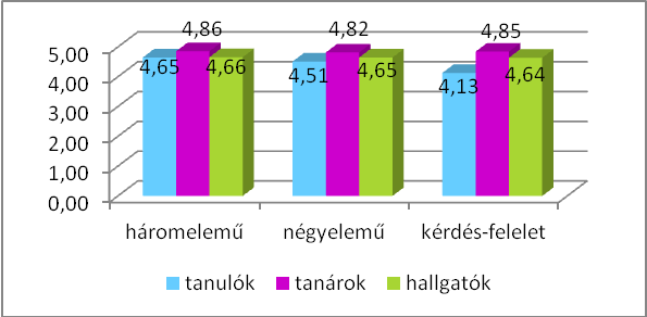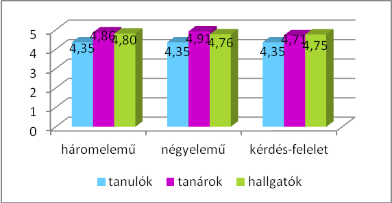 A kipróbálásban részt vevő 14 tanár véleménye ugyan iránymutató, de – az adatok alacsony száma miatt – óvatosan kezelendő. Ehhez képest a magyar anyanyelvű hallgatók csoportja (88 fő) igen sok adattal szolgált, így ebben a kérdésben az átlagos osztályzatokat érdemes megfigyelni (7. ábra). A diagram 3. oszlopa minden esetben a nyelvtanulók osztályzatainak átlagát jelzi, így egybevethető a magyar anyanyelvűek előfeltevése a nyelvtanulók tényleges véleményével: