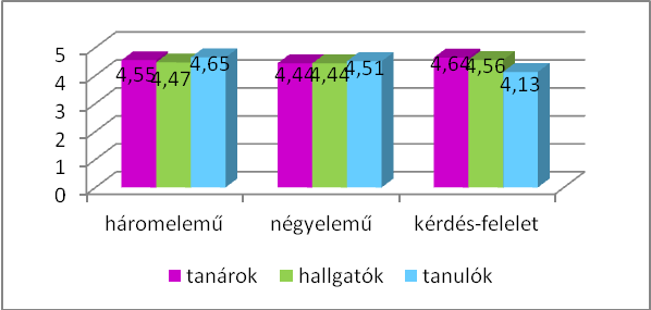 A kapott eredmények egybevetéséből kiviláglik, hogy leginkább a nyelvtanárok értették meg a szórendi szabályokat. Ez az eredmény természetes, hiszen ez a vizsgált adatközlői kör rendelkezik a legtöbb előismerettel anyanyelve nyelvtanát illetően. A magyar anyanyelvű hallgatók esetében is látható, hogy az adott értékek többsége jeles és jó; a közepesek aránya 3–9% között mozog. A kérdés-felelet mondatszerkezetének megértését 1 nyelvtanár nem értékelte – a megkérdezett nyelvtanárok viszonylag alacsony száma miatt ez a válaszadók 7%-át teszi ki. Ugyanígy 1 nyelvtanuló nem jelölt be értéket ugyanebben a kérdésben; ez a nyelvtanulók 4%-a. Mindkét érték elhanyagolható a többi, pozitív válasz száma mellett.