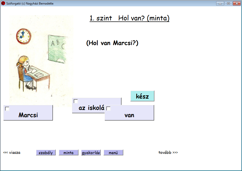 A tanár a program kezdőlapján a Szint számozott menüpontjaira kattintva választhatja ki, melyik ponton kezdi a program használatát. A mintaprogram minden szintjén lehetőség van a szabály prezentációjára, a mintafeladat bemutatására, illetve minimális gyakorlásra is. A tanítandó szórendi szabályt egy mintamondat szemlélteti, amelyhez hívókép is tartozik. Az 1. szinten, amely a hol? kérdésre felelő helyhatározót tartalmazó semleges mondat felépítését mutatja be, a Szabály lépésben egy kislányt ábrázoló kép jelenik meg, aki láthatóan iskolában van: iskolapadban ül és ír. A falon iskolatábla és egy óra látható, amely 9 órát mutat. A kép mellett zárójelben tűnik fel a kérdés: Hol van Marcsi? A kérdés alatt előtűnik a teljes mondat: Marcsi az iskolában van. A képernyő alján jönnek elő a mondat szavai a Szóforgató lapjaihoz hasonló négyzetekben, majd alattuk a színes szabály. Végül a mondat szavai is beszíneződnek a szabály színeinek megfelelően (3. ábra).