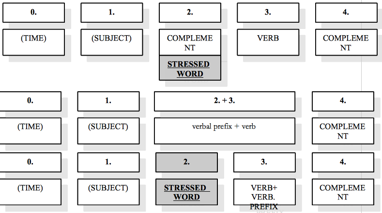 A szabályrendszer részletes ismertetése nem feladata a jelen írásnak (lsd. Nagyházi 2007: 30–43), de az oktatóprogram megértéséhez nélkülözhetetlen megismerni a lényegét. Ebben a szabályrendszerben a szabályok kétféle oppozícióban (illetve ezek kombinációjában) jelennek meg: egyrészt a semleges és a nyomatékos mondat, másrészt az igekötőt tartalmazó, illetve nem tartalmazó mondatok elkülönítésében. A felnőttek oktatásában a mondat pozícióit –az alkalmazott közvetítő nyelv miatt – angol nyelvű grammatikai terminus technikusok jelölik. A szabályokat összefoglalóan tartalmazza az 1. ábra.
