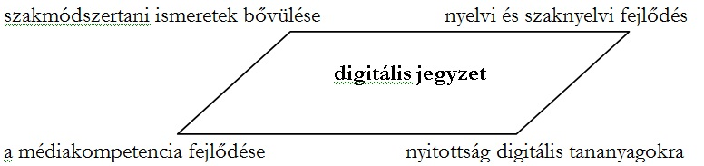 2.2. A digitális jegyzet pozitív hatása használóira. Egy digitális jegyzet pozitív és negatív tulajdonságaival együtt jelentős szerepet játszik abban, hogy használóinak, leendő némettanároknak nyelvi és szakmai tudásán túlmenően digitális médiahasználati kompetenciája alakuljon ki és fejlődjön (lásd 1. ábra).