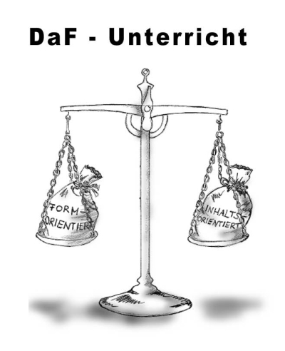 3.3. A jegyzet felépítése. Az „Ausgewählte Fragen der Deutschdidaktik” (Reder 2011) című jegyzet tizenkét fejezetre tagolódik. Minden fejezet szöveges részt, illusztrációkat, ugrópontokat és feladatokat tartalmaz. Szemléltetésül rajzok, képek és szkennelt tankönyvi példák szolgálnak, melyek általában nyitott feladattal párosulnak. Így például a 3. ábrán látható rajz3 a formaorientált gyakorlatok és tartalomközpontú feladatok optimális arányáról szóló eszmecsere kiindulópontja.