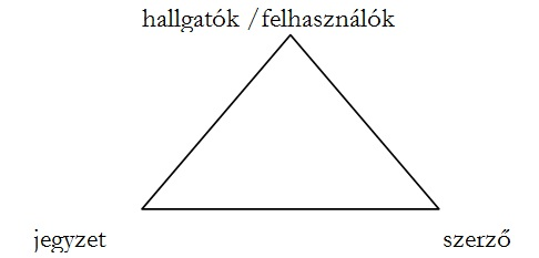 3.1. Szerzői motiváció..A fenti leírásból láthatjuk, hogy a digitális jegyzetnek mint „műfajnak” előnyei számosak, de több területen még fejlesztésre szorul annak érdekében, hogy csökkenjenek hátrányai. A felhasználók szempontjából azonban egyértelműen megállapítható: a pozitívumok dominálnak. A jegyzet – felhasználó – szerző háromszögből (lásd 2. ábra) a 2. pont alatt már két elemet érintettünk, így most a jegyzetíró motivációjára térünk rá. Korábbi próbálkozásaim számítógéppel támogatott szemináriumokon és a hallgatók pozitív visszajelzései késztettek arra, hogy digitális jegyzettel kísérletezzek. Megtapasztaltam az internet nyújtotta újszerű oktatási formákat, amikor hallgatói bíztatásra 2005 és 2009 között yahoo-oldallal támogatott nyelvészeti kurzusokon igyekeztünk kihasználni a médiumból eredő lehetőségeket (lásd URL: http://de.groups.yahoo.com/group/phraseologie/1 ). A következő határozott lépés a tananyagok digitalizációja felé az volt, hogy kezdetektől fogva élek a lehetőséggel és használom PTE CooSpace-nek nevezett elektronikus tanulási környezetét. Ezeket a platformokat arra használtam, hogy a hallgatók számára lehetővé tegyem a tananyagok letöltését, egymás produktumainak elérését. Ekkor még nem törekedtem arra, hogy a jegyzetanyagok interaktívan működjenek. Az interaktív fejlesztési lehetőséghez egy TÁMOP-pályázat nyújtott keretet (TÁMOP 412-08/1/B-2009-0003), amely elvezetett a digitális német szakmódszertani jegyzet megszületéséhez.