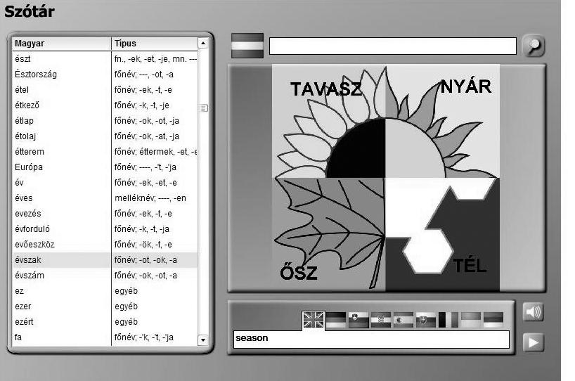 A munka 2008-tól folytatódott, amikor a Balassi Intézet vezetése úgy határozott, hogy a magyar nyelv és kultúra külföldi képviseletének kiemelt intézete is rendelkezzék egy olyan, mindenki számára elérhető, ingyenes multimédiás tananyaggal, ami a legkorszerűbb igényeket is kiszolgálja, bárhol is üljön a nyelvtanuló a számítógép (vagy a tanteremben az aktív tábla) elé.2 Először a legszélesebb kör érdeklődésére számot tartó, kezdő szintű tananyag készült el az intézet saját fejlesztésében eMagyarul címmel, majd a Miniszterelnöki Hivatal Kisebbség- és Nemzetpolitikáért Felelős Szakállamtitkársága jelentős támogatásával az ehhez tartozó, különleges fejlesztésű, 2000 szavas alapszókincset tartalmazó, tízszer tíz nyelven kereshető, képes–hangos szótár, amely az angol, a német és a spanyol mellett a környező országok nyelveit (szlovák, ukrán, román, szerb, horvát, szlovén) is tartalmazza. A nem magyar nyelvről történő keresést virtuális billentyűzet teszi lehetővé. A következő kép a szótárból mutat be egy mintát, amelyen látható, hogy nemcsak lexikai megfeleltetést találja meg a nyelvtanuló, hanem azokat a kritikus grammatikai pontokat is, amelyek többnyire nehézséget okoznak az igék, főnevek használatában: