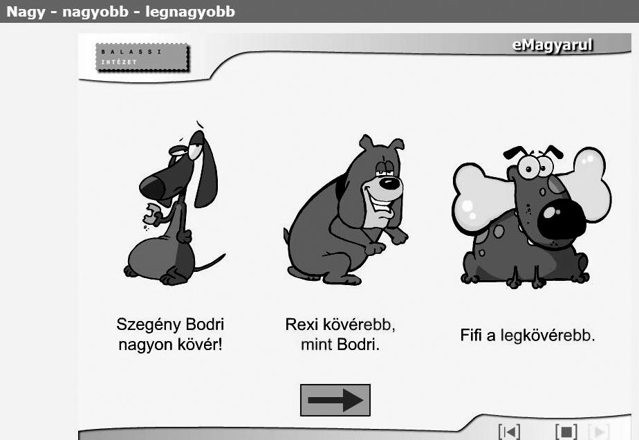 A szép kivitelű, komplex készségfejlesztésre vállalkozó munkáltató tankönyvet, amelynek azóta a második kötete is megjelent, a filmet és a játékos feladatokat örömmel fogadták a gyerekek, tanáraik pedig nagy segítséget kaptak a tanári kézikönyvvel és a sokszorosítható játékokkal, valamint az igényes hangfelvételekkel. Az elektronikus tananyag a Balassi Intézet honlapján érhető el, innen származik a kép is (2. ábra).