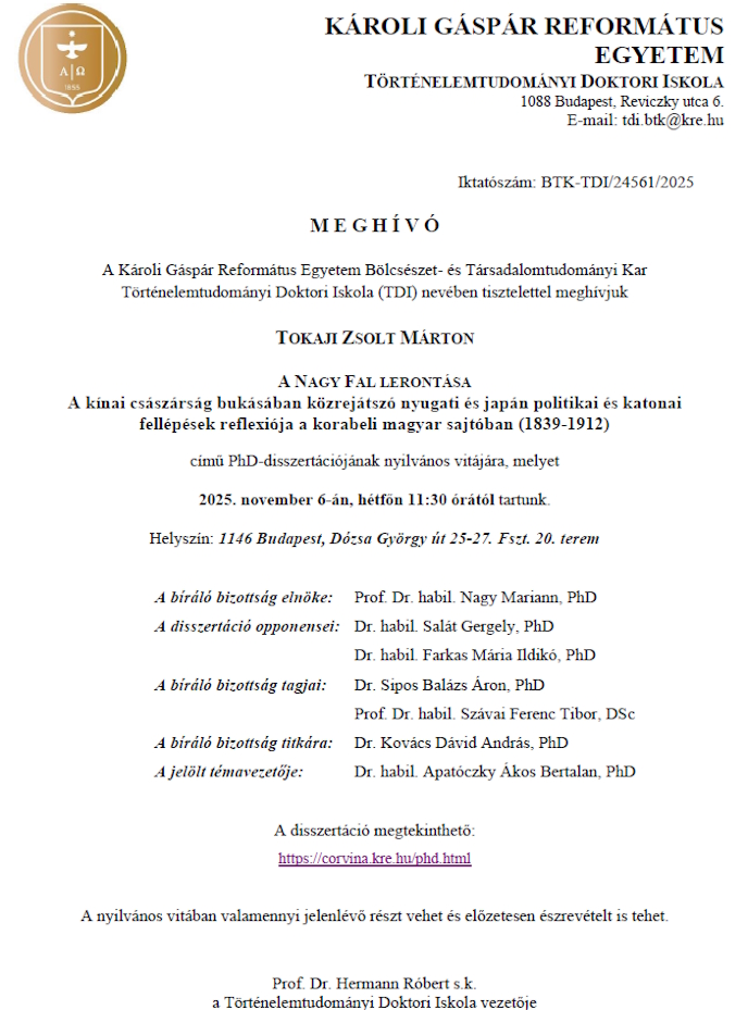 MEGHÍVÓ Tokaji Zsolt Márton PhD-disszertációjának nyilvános vitájára
