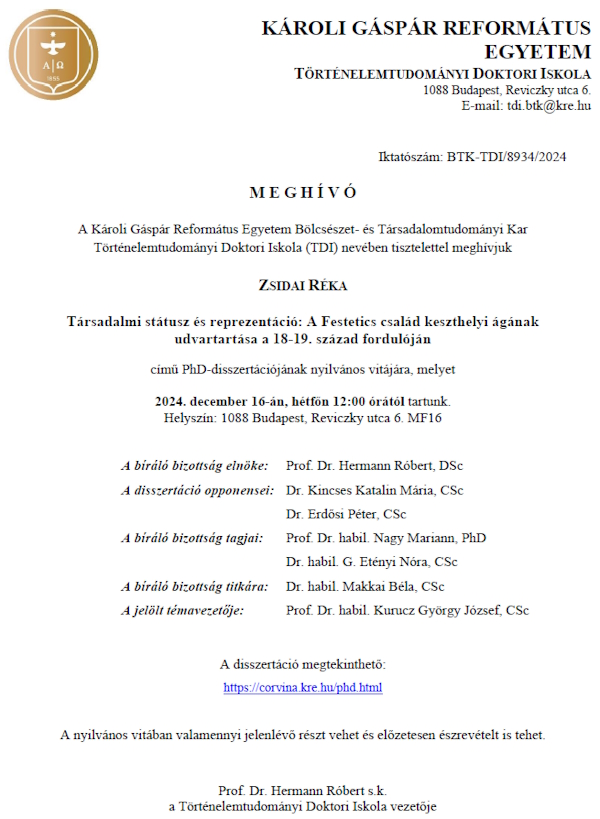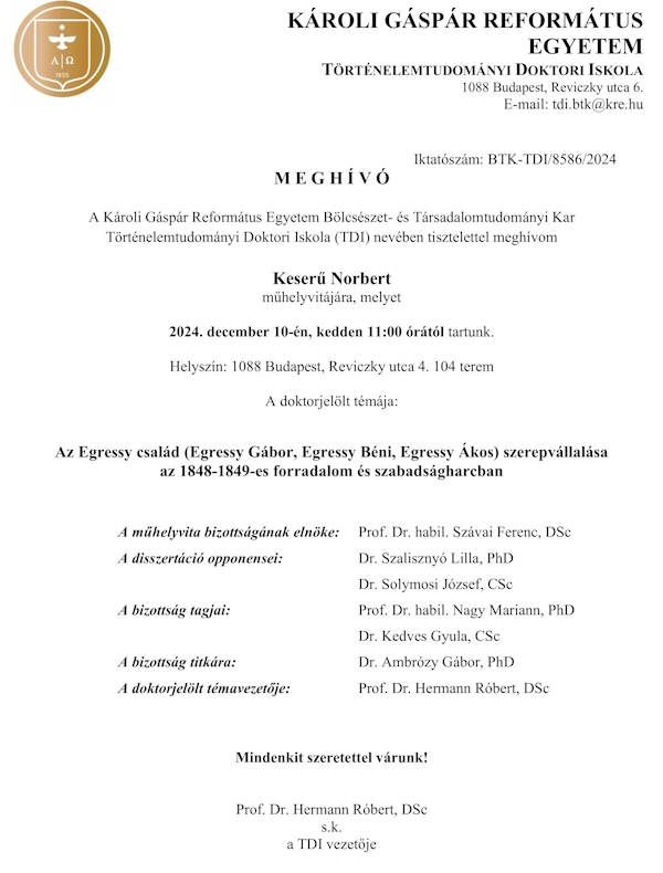 Mindazok, akik a Károli Gáspár Református Egyetem Történelemtudományi Doktori Iskolájában szeretnék magukat tovább képezni és történelemből PhD fokozatot szerezni olyan oktatókkal, témavezetőkkel dolgozhatnak együtt, mint Gergely András, Hermann Róbert, Szakály Sándor, Szabó Péter, Kurucz György, Kun Mikós és a sor hosszan lehetne folytatható…